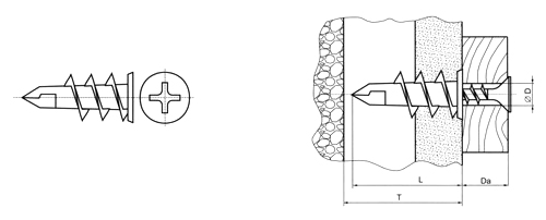| Обозначение | D диаметр дюбеля, мм | L длина дюбеля, мм | Т мин. расстояние до стены, мм | Da макс. толщина прикрепляемого материала, мм | Ds диаметр применяемого шурупа, мм | Длина применяемого шурупа, мм | Мин. вырыв. сила, кН гипсокарт. 12 мм |