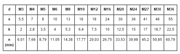 | Диаметр описанной окружности e, не менее | 8,8 | 11,1 | 14,4 | 18,9 | 21,1 | 24,5 | 26,8 | 30,1 | 33,5 | 35,7 | 40 | 45,6 | 51,3 | 61,3 | 72,6 | 83,9 | |