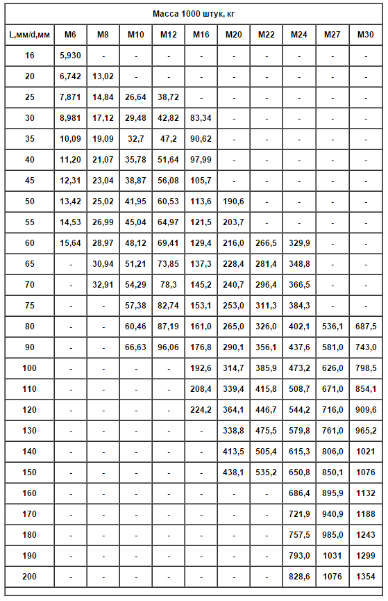 Масса болтов ГОСТ 7805-70 (крупный шаг резьбы). Вес размером М10, М12, М14, М22 указан в соответствии с параметрами их производства согласно 1 таблице.